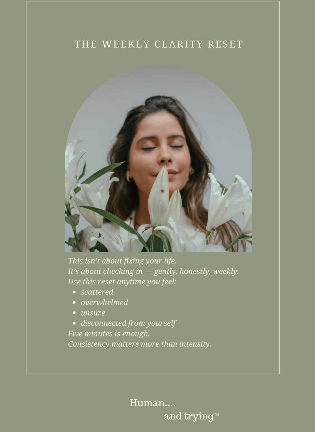 The Weekly Clarity Reset program is a gentle, 5-minute check-in designed for individuals navigating the complexities of everyday life without feeling overwhelmed. This program is tailored to help you quiet the mental chatter, realign with your priorities, and steer yourself in the right direction - all without the stress of perfectionism or rigid goal-setting. This initiative is not about fixing yourself or imposing strict targets; instead, it encourages you to pause, observe, and make your next move with a clear and thoughtful mindset. Whether you choose to engage with it on a weekly basis or whenever the noise of life becomes too loud, you can revisit this program as frequently as needed to regain your focus and composure. Download it FREE today and get started.